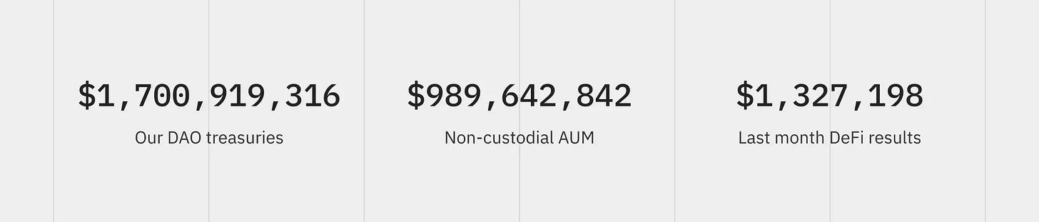 Investment Policy Statement - a new investment policy statement (IPS) sets out the DAO’s expectations and guidance for the management of its treasury and the roles of key stakeholders. IPSs help to clarify difficult questions before issues arise, minimising the space for future disagreement or misalignment. Check out our article on IPSs to learn more.